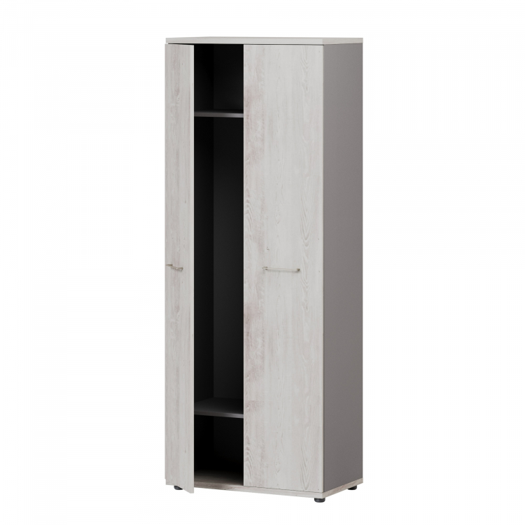 Шкаф имеет 2 полки. Под верхней полкой крепится фронтальная штанга на двух штангодержателях. Полки расположены на расстоянии 377 мм от верхнего и от нижнего топа. Полки выполнены из ЛДСП «Кубанит серый» толщиной 18 мм облицованы кромкой ПВХ 0,8 мм. Размеры: ширина 762 мм, глубина 426 мм.